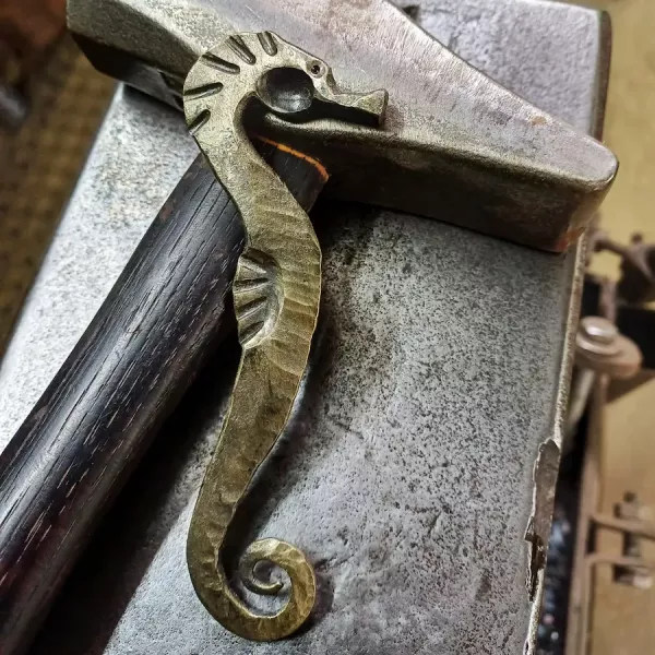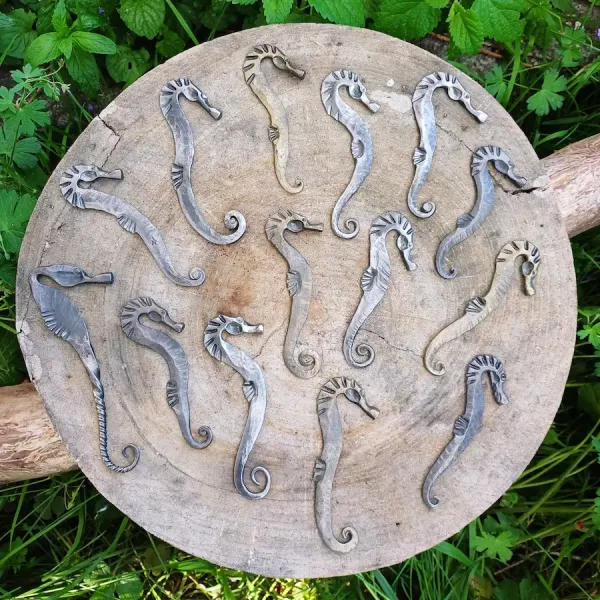 Aus 10mm Rundstahl, Hammerschlag für Hammerschlag, entstanden die ersten Seepferdchen. Das Schwierigste? Die Proportionen des Kopfes – zu kantig, zu rund, zu lang. Dann das Ausschmieden des Körpers und des Ringelschwanzes – jede Biegung eine Herausforderung, jede Form einzigartig.